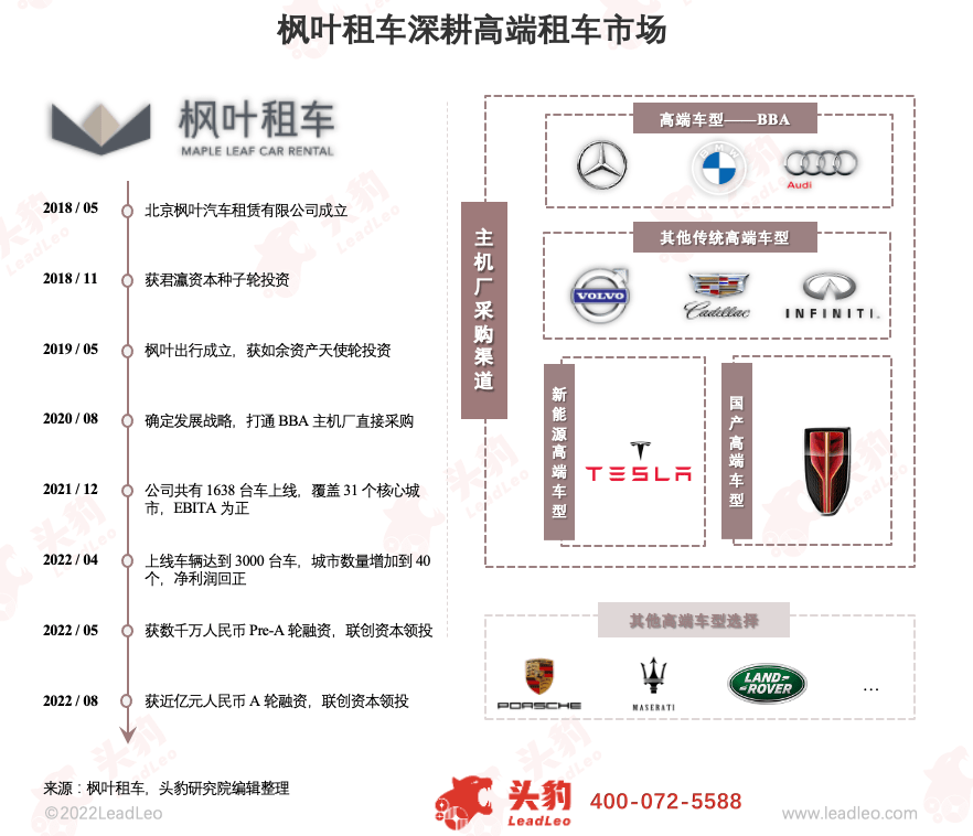 具备可靠车源、新车比例高和品控严格等产品服务及运营方面的优势的高端汽车租赁品牌将脱颖而出,并致力于探索汽车推广的新方式。枫叶租车先发布局并长期深耕高端汽车租赁市场,公司目前市场投放车辆超过 3000 台,共完成 30+ 中心城市覆盖、1200+ 服务网点的布局,在重点地区开设门店,能够为用户提供高质量租车服务。目前已打通 BBA(奔驰、宝马、奥迪)等国际豪华 OEM 品牌采购渠道,且与华晨宝马达成 3 年内采购 2 万台全新车型的战略合作。渠道运营方面,门店分布全国 40+ 城市,同时与携程达成合作,成为携程品牌租车平台中高端汽车租赁的最大供应商。另外,公司将与保时捷于 2022 年 12 月左右展开深度合作,预期进驻更多保时捷车辆完善旗下自营产品矩阵。公司作为高端汽车租赁行业标杆企业,与知名主机厂宝马通力合作能实现双方互惠共赢,一方面能为公司探索汽车业务提供新思路,另一方面也能打消消费者对车型选择少、车辆里程焦虑、汽车性能不明晰等顾虑。